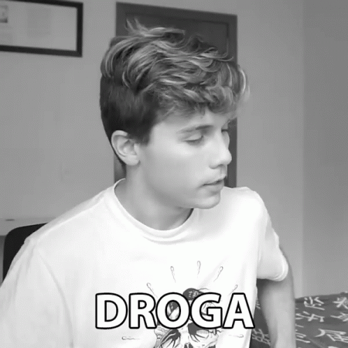 Gato Galactico in black and white, wearing a shirt with 'DROGA' printed, reacting.