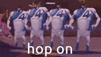 Multiple wide Mr. Fantastic characters, also known as Reed Richards, perform a synchronized dance with 'hop on' text.