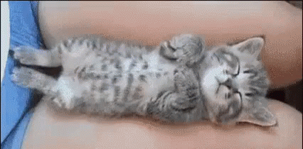 Adorable kitten sleeping soundly on its back on a person's lap, dreaming peacefully.