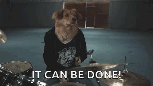 Drumdog Django, a dog in a Foo Fighters hoodie, energetically plays drums with the inspiring message 'IT CAN BE DONE!'
