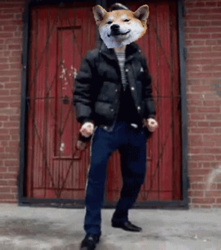Doge-headed person comically dancing and staggering while holding two bottles in front of a red door.