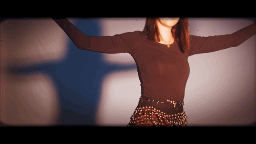 A young woman with long hair, wearing a brown shirt, poses with her arms outstretched in a vintage-style shot.