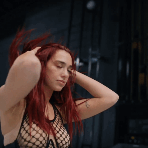 Dua Lipa with vibrant red hair, wearing a fishnet top, moving her head and running hands through her hair.