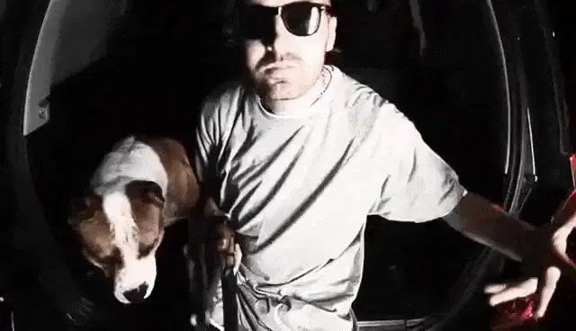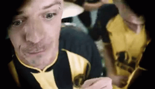 Dubioza Kolektiv member in a yellow and black shirt performing enthusiastically.