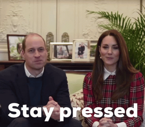 Prince William and Kate Middleton on a couch with the caption 'Stay pressed'.