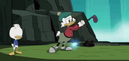 Scrooge McDuck and Dewey Duck experience frustration while golfing, with Scrooge repeatedly hitting a glowing golf ball.