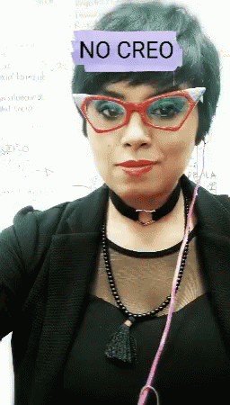 A woman with glasses and a 'NO CREO' sticker on her head expresses disbelief, possibly using sign language.