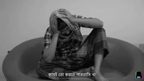 A distressed man sits, covering his face, with Bengali text overlay "I can't even do the work."