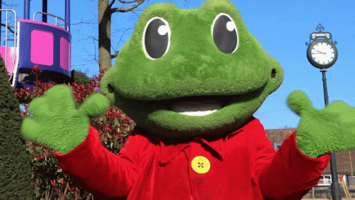 Rick De Kikker, the Duinrell Tikibad mascot, waves hello in front of a clock showing 4:20.