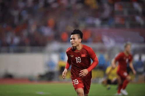Vietnamese footballer Quang Hải, wearing jersey number 19, reacts on the field with an expressive look and the caption 'Dư Lào?!'