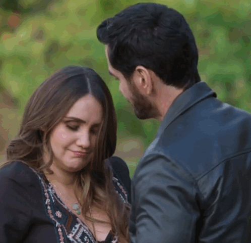 Dulce María and David Zepeda share an emotional hug, looking at each other with tenderness in an outdoor setting.