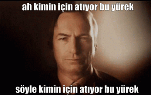 A man, resembling Saul Goodman, with the Turkish caption 'Ah kimin için atıyor bu yürek' (For whom does this heart beat).