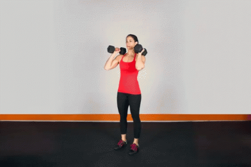 A woman performs a standing dumbbell overhead press, lifting weights from shoulder height to overhead.