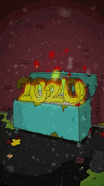An animated dumpster fire with the year '2020' burning inside, symbolizing a difficult year.