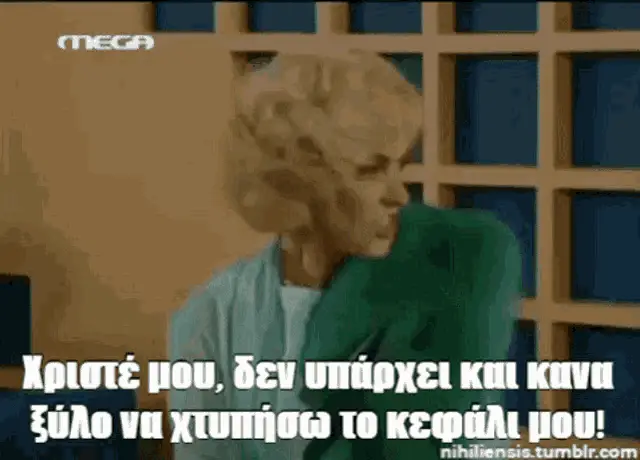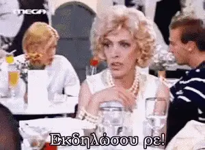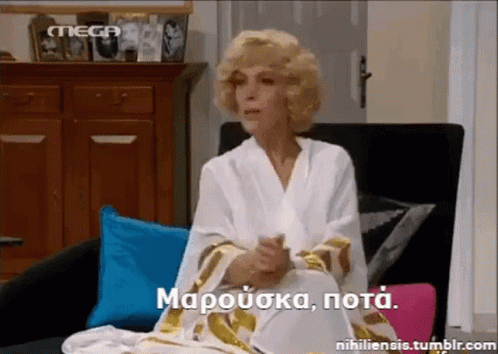 Marouska from Duo Ksenoi, wearing a robe, sits on a couch and asks for drinks, possibly from Nteni.