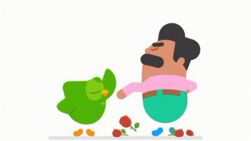 Duolingo's Duo and Hungboris celebrate with a dance, dropping roses in a joyful animation.
