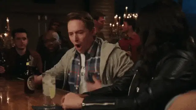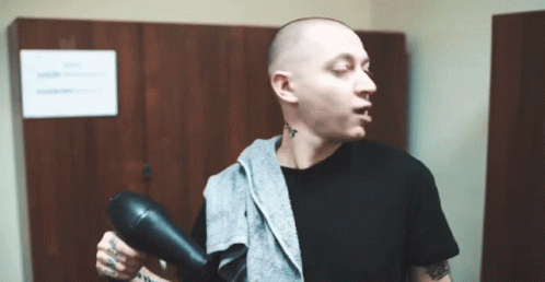 Russian rapper Oxxxymiron (Miron Yanovich Fyodorov) making a funny face while holding a hairdryer.
