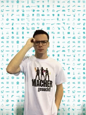 Man wearing "MACHER gesucht!" shirt cleans his glasses, puts them on, and smiles.