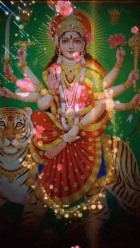 Animated image of Durga Maa, the Hindu goddess, riding a tiger with sparkling effects and a 'Good Morning' message.