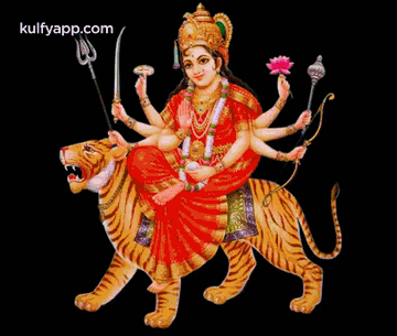Hindu Goddess Durga, depicted with multiple arms and holding various symbols, riding a majestic blue tiger.