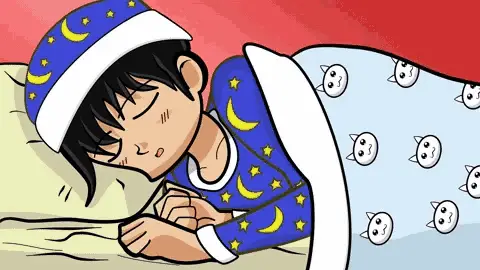 Woman peacefully sleeping, wearing a striped sleep cap with a pom-pom, accompanied by 'Zzz' animation.