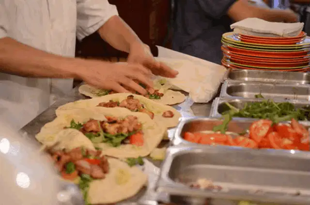 Man in a red jacket aggressively eating a large durum kebab, with a bottle of Erikli water nearby.