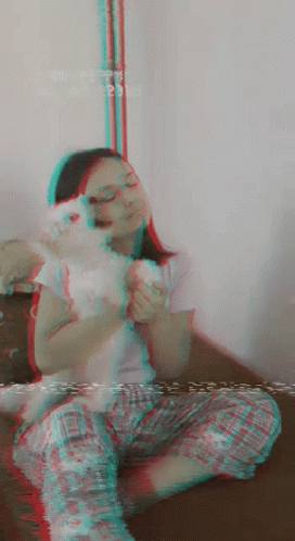 Marija cuddling a small white cat on a couch, with a retro glitch effect.