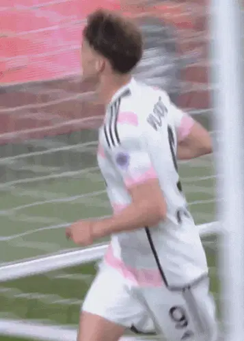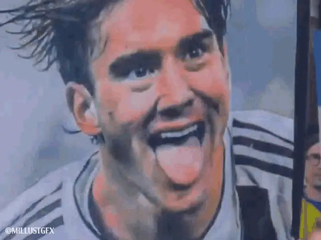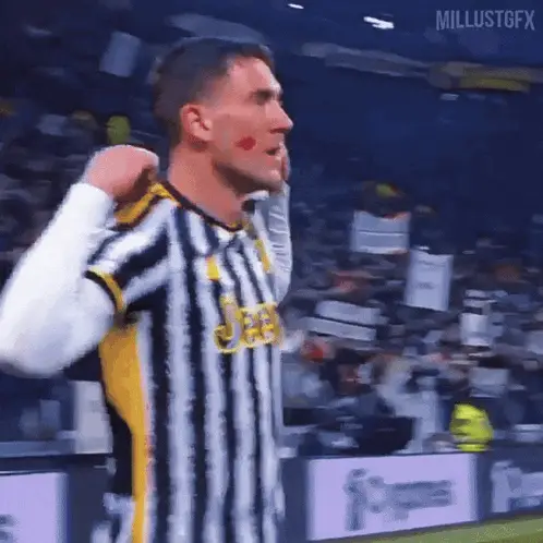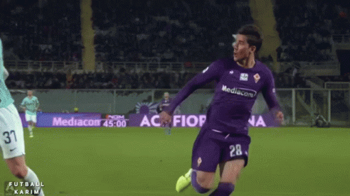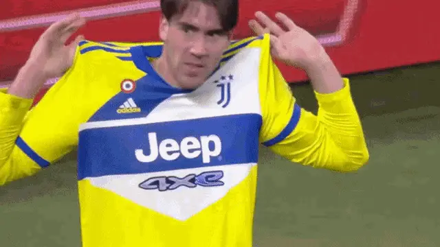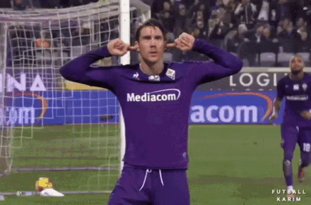 Dusan Vlahovic, in his purple Fiorentina jersey, celebrates a goal on the football pitch.