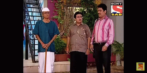 Jethalal, Mehta Saab, and an older man stand together, engaged in conversation in a lively outdoor setting.
