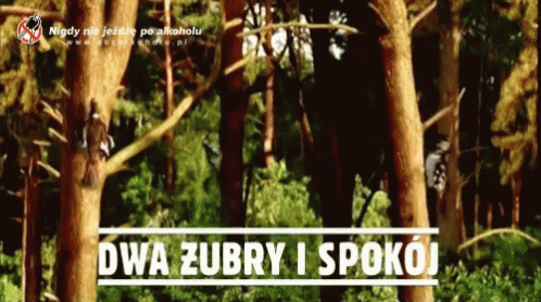 Two European bison (żubry) stand peacefully in the Białowieża Forest, with Polish text "DWA ZUBRY I SPOKÓJ".