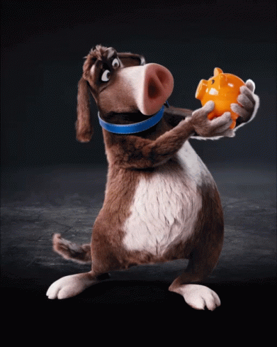 Dws Sparschweinehund, the cute cartoon dog, stands upright holding an orange piggy bank, symbolizing saving money.