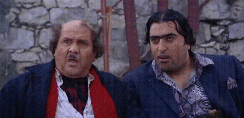 As'ad and another man from the Syrian series Deiaa Dayaa react with wide eyes and open mouths, making a whistling sound in surprise.