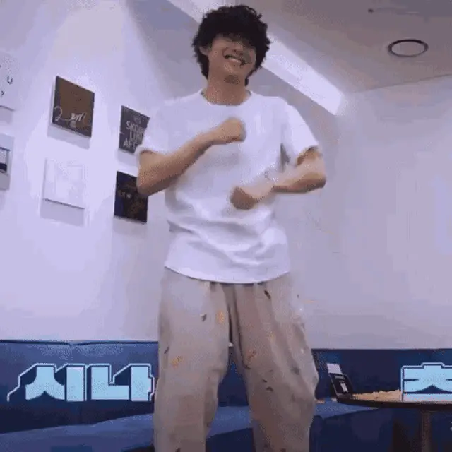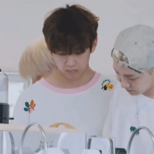 Taehyung looking sleepy and puffy, wearing a white shirt with colorful embroidery, appearing unbothered.