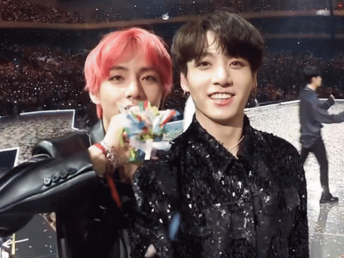 Dynataees Taekook (Jungkook and Taehyung) smiling happily on stage amidst falling confetti.