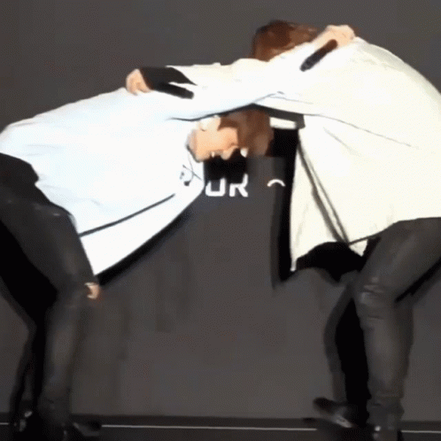 BTS members Jungkook and Taehyung (Taekook) share a playful hug and wrestle on stage.