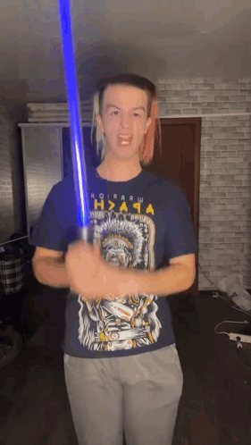 Иван Золо демонстрирует свои навыки джедая, энергично размахивая синим световым мечом в стиле Звёздных Войн.