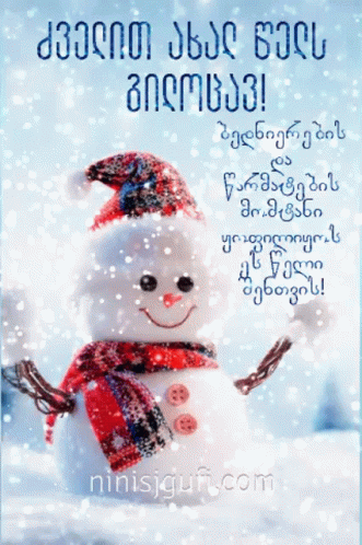 A festive snowman wearing a Santa hat and scarf, with Georgian text wishing a Happy Old New Year.