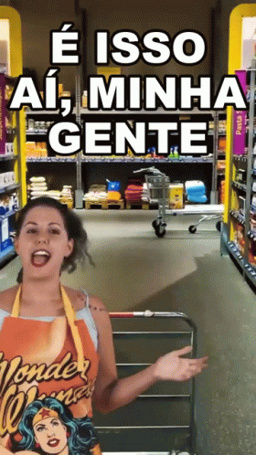 Nina Marcucci, wearing a Wonder Woman apron in a supermarket, exclaims 'É Isso Aí, Minha Gente!'.