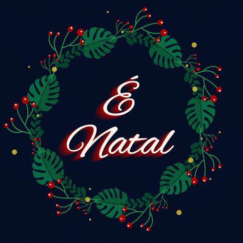 An animated Christmas wreath with leaves and berries frames the Portuguese text "É Natal" (It's Christmas).