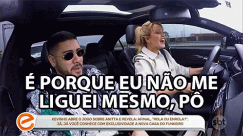Eliana and Mc Kevinho in a car, discussing Anitta and the phrase 'E Porque Eu Nao Me Liguei Mesmo Po' from Programa Eliana on SBT.