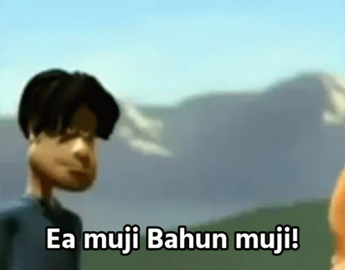 An animated character stands before mountains, uttering the phrase "Ea muji Bahun muji!".