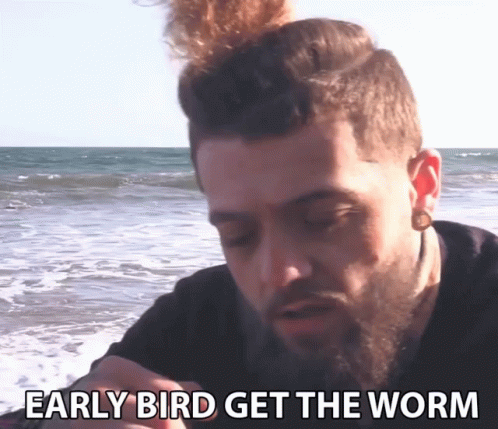 A man with a beard on a beach, featuring the motivational idiom 'Early Bird Get The Worm'.