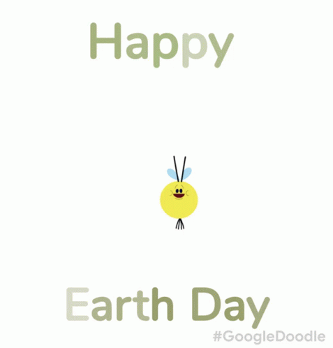 Animated Google Doodle celebrating Happy Earth Day, featuring a cute bee pollinating various colorful flowers.