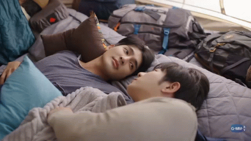 Earth Pirapat and Mix Sahaphap share a tender moment, lying together in a cozy tent.