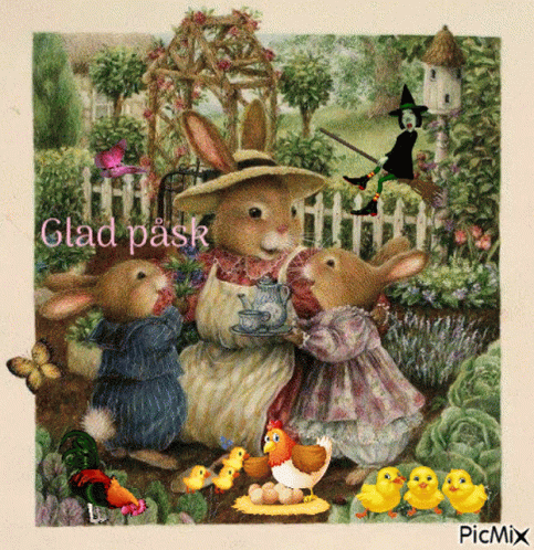 An illustration of Easter bunnies, chicks, and a witch, with 'Happy Easter' written in Swedish.