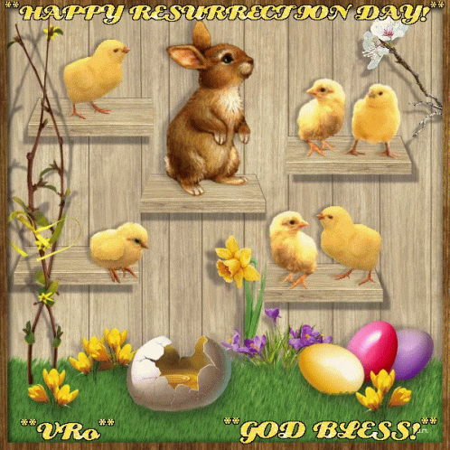 A festive Easter greeting card featuring a cute bunny, fluffy chicks, and colorful eggs, wishing a Happy Resurrection Day.