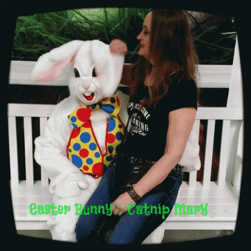 Catnip Mary poses happily with the Easter Bunny on a white bench, celebrating the holiday.
