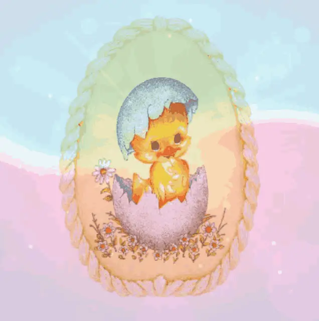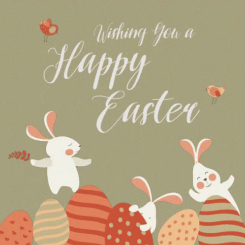 Animated Easter greeting card featuring cute bunnies, colorful eggs, and the message 'Wishing you a Happy Easter'.