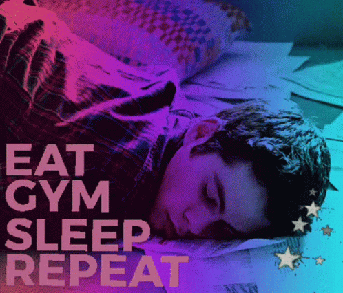A young man sleeps soundly, embodying the 'Eat Gym Sleep Repeat' daily grind.