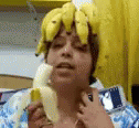 Tulla, wearing a unique hat made of bananas, happily enjoys eating a peeled banana.